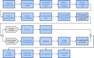 - Этапы проведения закупочной процедуры: формирование заголовка, выбор предмета закупки, выбор участников (поставщиков) , рассылка запросов, получение оферт, формирование конкурентного листа (КЛ), выбор победителей, согласование КЛ, утверждение КЛ протоколом конкурсной комиссии, формирование графика поставок (долгосрочные поставки) и спецификаций с поставщиком.
